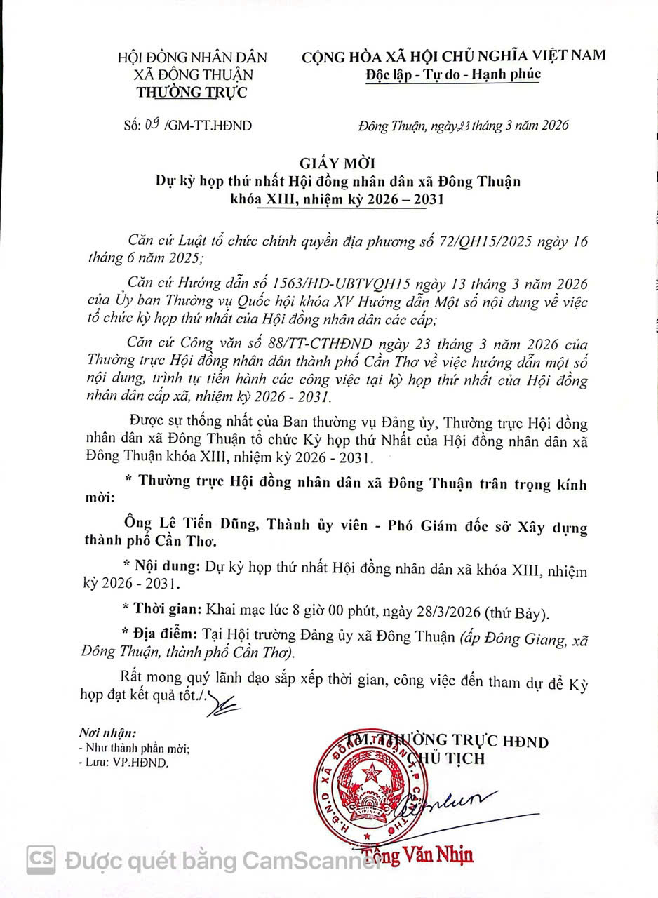 08:00: Phó Giám đốc Lê Tiến Dũng dự Kỳ họp thứ nhất HĐND xã Đông Thuận khóa XIII, nhiệm kỳ 2026 - 2031 (