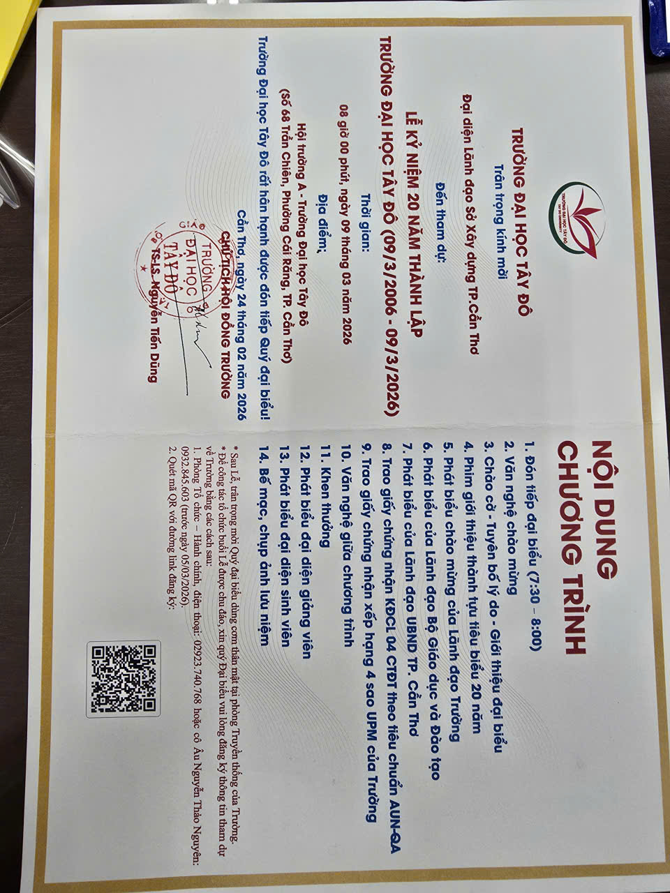 theo Giấy mời). Điểm tại Hội trường A, Trường Đại học Tây Đô