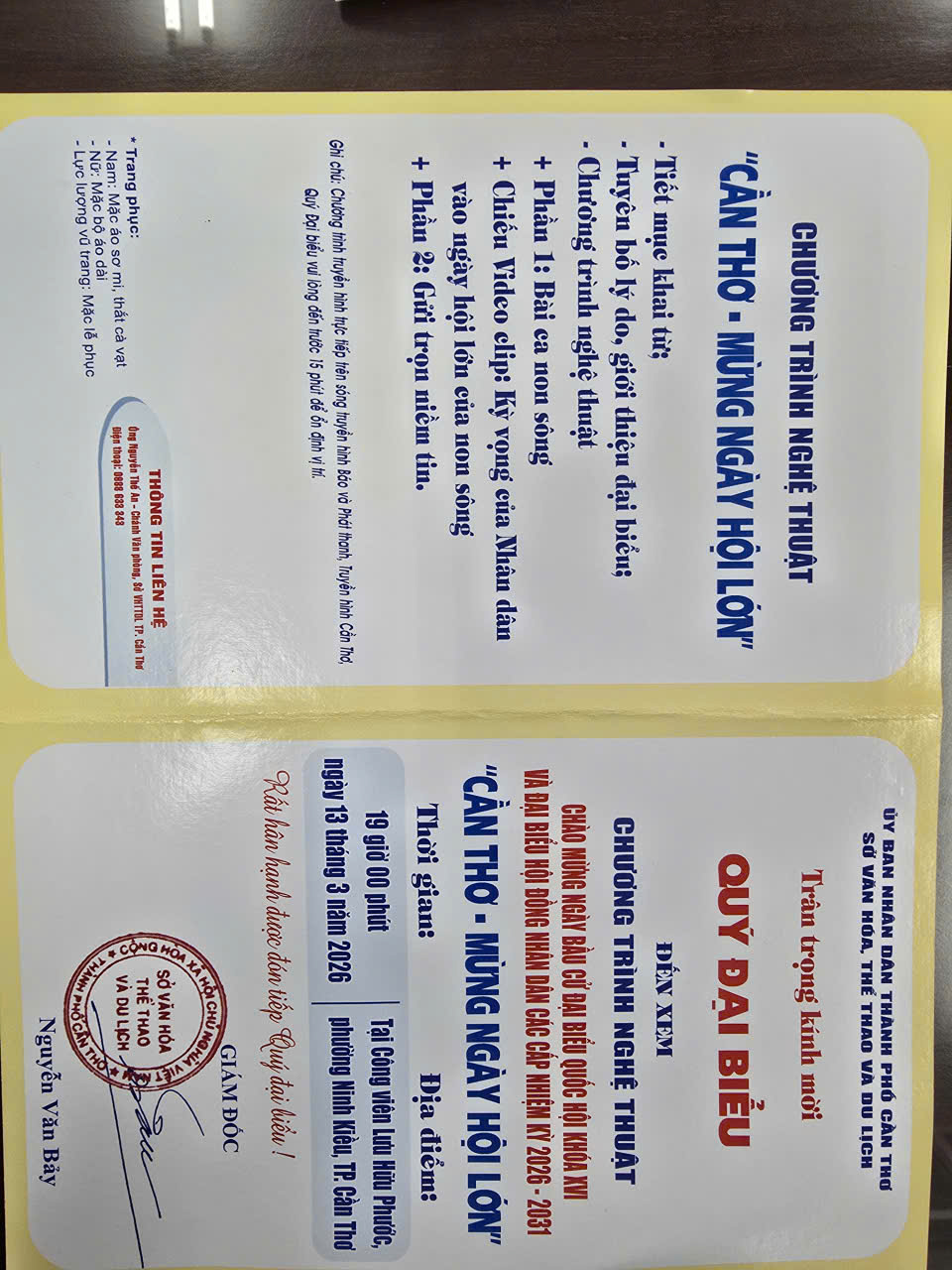 19:00: Phó Giám đốc Trần Lê Trung dự Chương trình nghệ thuật chào mừng ngày bầu cử Đại biểu Quốc hội Khóa XVI và Đại biểu HĐND các cấp nhiệm kỳ 2026 - 2031 "Cần Thơ - Mừng ngày hội lớn" (