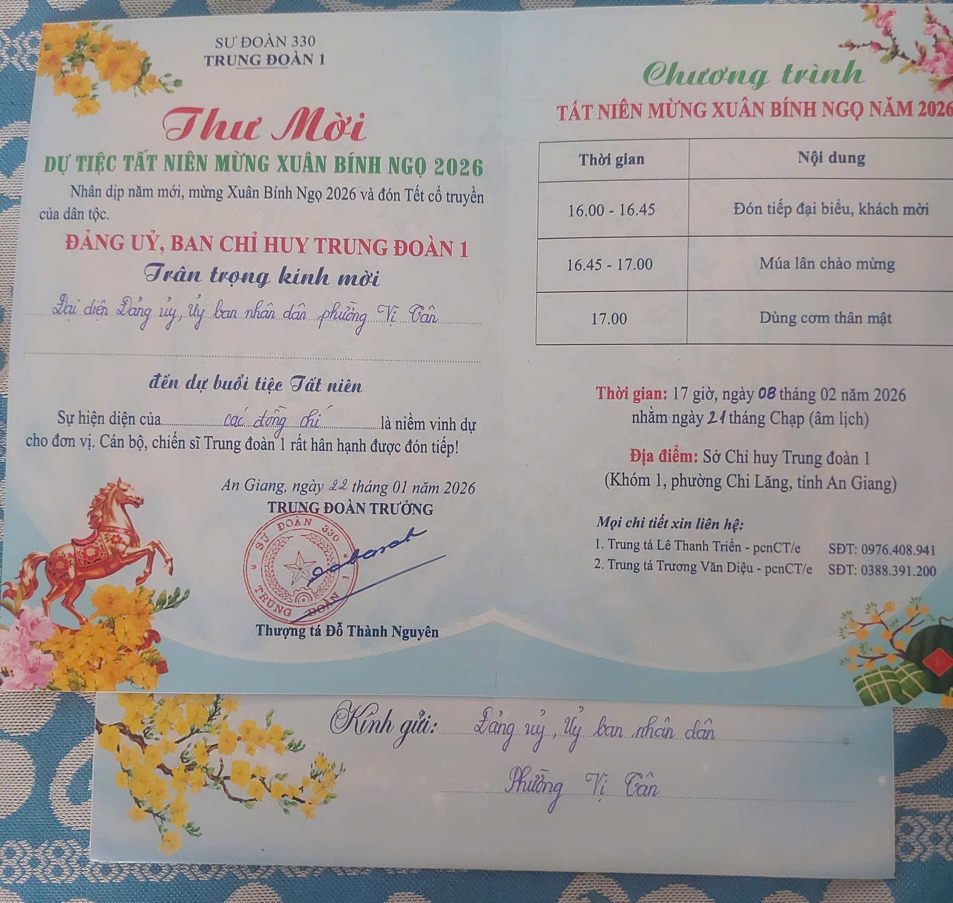 - 17 giờ 00: Phó Chủ tịch Lưu Văn Dủ dự tiệc Tất niên mừng Xuân Bính ngọ năm 2026. Thành phần: Chỉ huy trưởng Ban Chỉ huy Quân sự phường cùng dự. Điểm tại: Sở Chỉ huy Trung đoàn 1 (Khóm 1, phường Chi lăng, tỉnh An Giang; Nhân viên Văn phòng: Đ/c Tình (Theo GM SƯ ĐOÀN 330.jpg)
