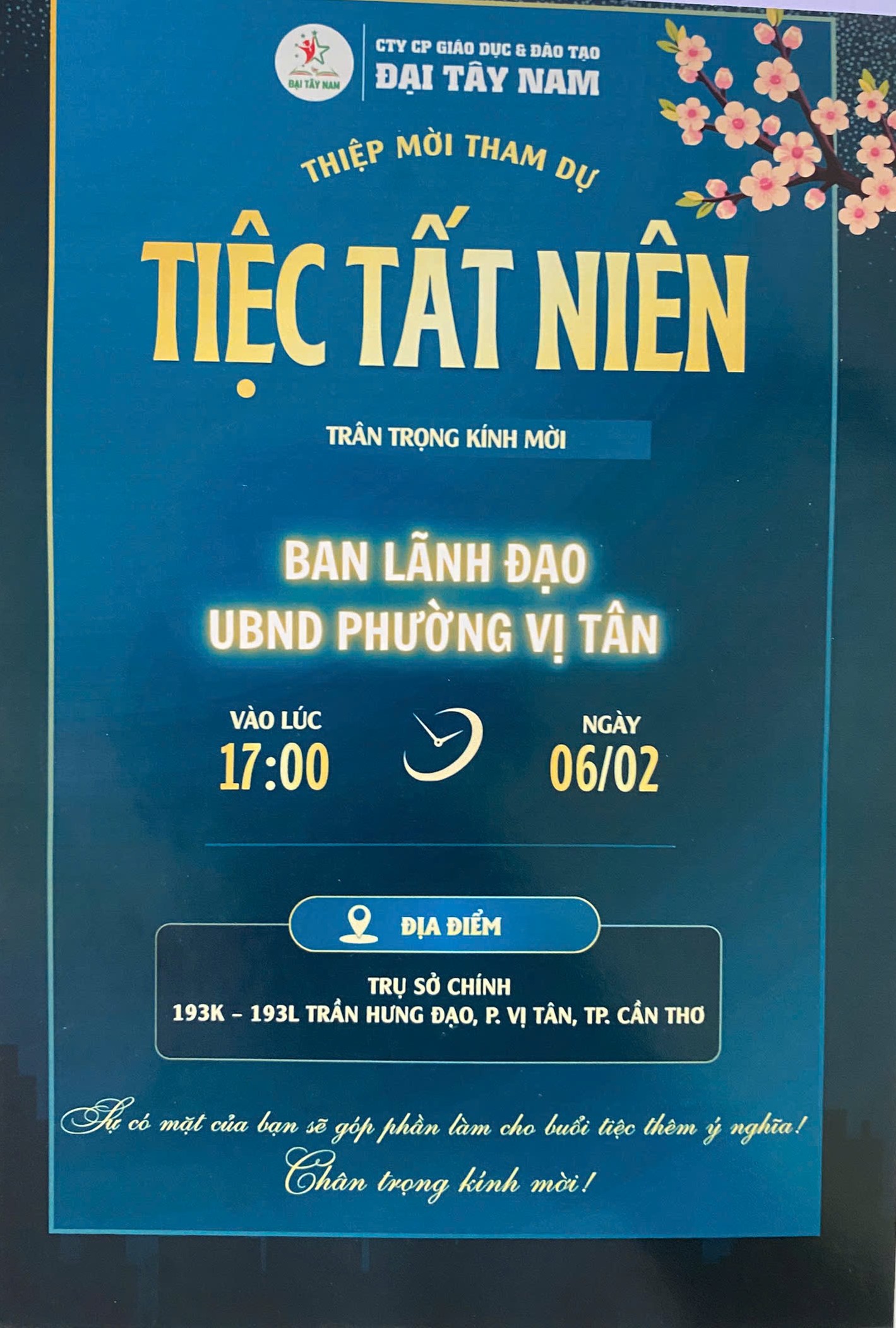 - 17 giờ 00: Phó Chủ tịch Tô Minh Điền dự tiệc tất niên Công ty Cổ phần Giáo dục và Đào tạo Đại Tây Nam. Điểm tại: 193K - 193L đường Trần Hưng Đạo, phường Vị Tân, thành phố Cần Thơ; (Theo GM TIỆC TẤT NIÊN-TÂY NAM.jpg)