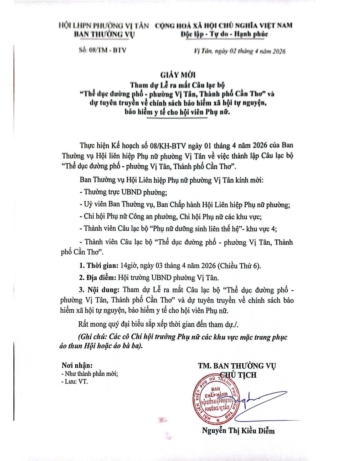 - 14 giờ 00: Phó Chủ tịch Tô Minh Điền dự Lễ ra mắt Câu lạc bộ " Thể dục đường phố - phường Vị Tân, thành phố Cần Thơ" và dự tuyên truyền về chính sách bảo hiểm xã hội tự nguyện, bảo hiểm y tế cho hội viên Phụ nữ. Điểm tại: Hội trường UBND phường; (Theo GM SỐ 08.jpg)