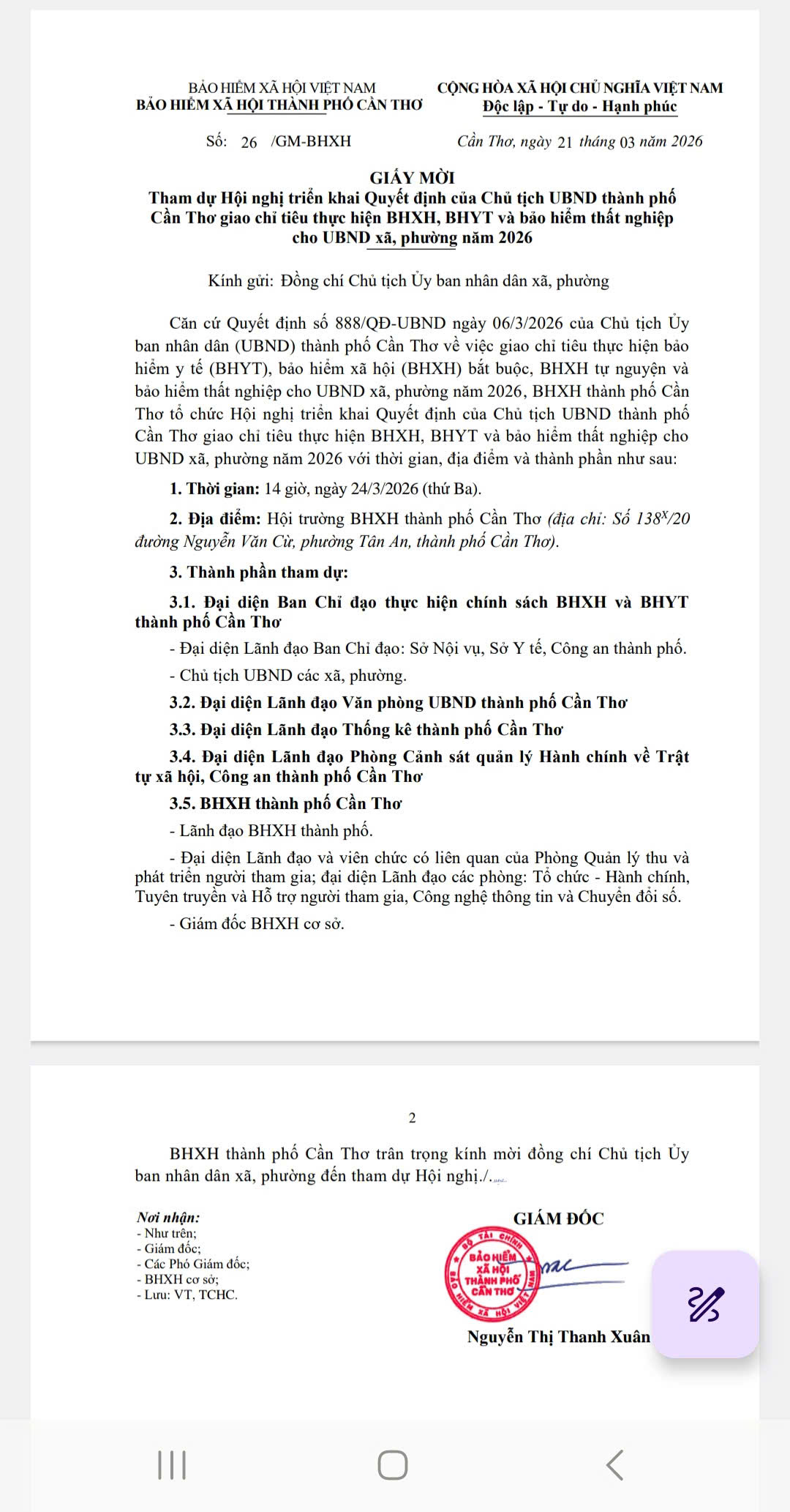 - 14 giờ 00: Phó Chủ tịch Tô Minh Điền dự Hội nghị triển khai Quyết định của Chủ tịch UBND thành phố Cần Thơ giao chỉ tiêu thực hiện BHXH, BHYT và bảo hiểm thất nghiệp cho UBND xã, phường năm 2026. Điểm tại: Hội trường BHXH thành phố Cần Thơ (số 138/20 đường Nguyễn Văn Cừ, phường Tân An, thành phố Cần Thơ); (Theo GM 26.jpg)