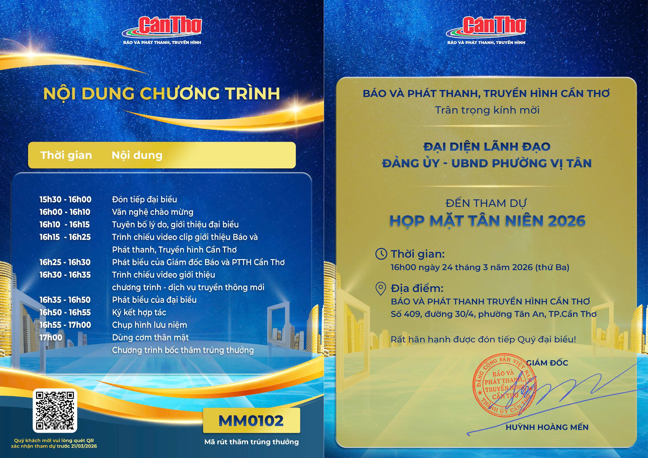 - 16 giờ 00: Phó Chủ tịch Tô Minh Điền dự họp mặt tân niên năm 2026. Điểm tại Báo và Đài Phát thanh Truyền hình Cần Thơ, số 409, đường 30/4, phường Tân An, TP. Cần Thơ; (theo Giấy mời của Báo và PTTH Cần ThơTM VỊ TÂN.jpg)