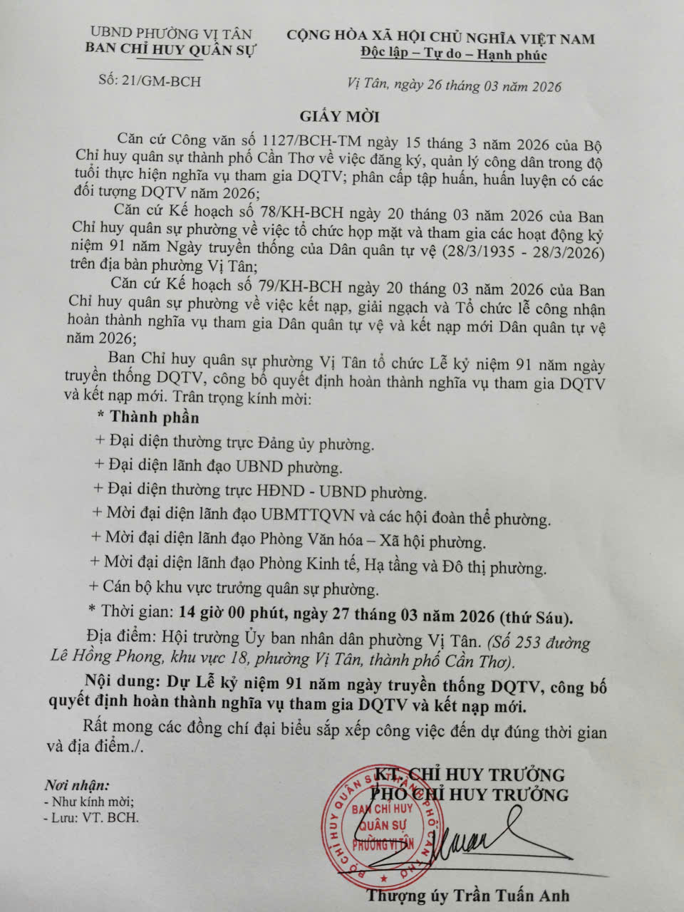 - 8 giờ 00: Phó Chủ tịch Lưu Văn Dủ dự họp đối thoại với các hộ dân khiếu nại về phương án bồi thường, hỗ trợ, tái định cư dự án Khu Tái định cư phường IV và dự án Cầu và Đường Nguyễn Chí Thanh. Thành phần: Mời Chi nhánh Phát triển quỹ đất Khu vực VIII; Thành viên Tổ giải quyết khiếu nại phường Vị Tân theo QĐ số 453/QĐ-UBND ngày 16/3/2026 của Chủ tịch UBND phường (25-QD-kiện-toàn-Tổ-giải-quyết-khiếu-nại-tố-cáo.signed.pdf). Điểm tại: Hội trường UBND phường; LĐVP: Đ/c Sự; CVVP: Đ/c Trung; (Giao Phòng Kinh tế, Hạ tầng và Đô thị chuẩn bị nội dung, mời thành phần dự họp theo QĐ số 453/QĐ-UBND và mời hộ dân)
