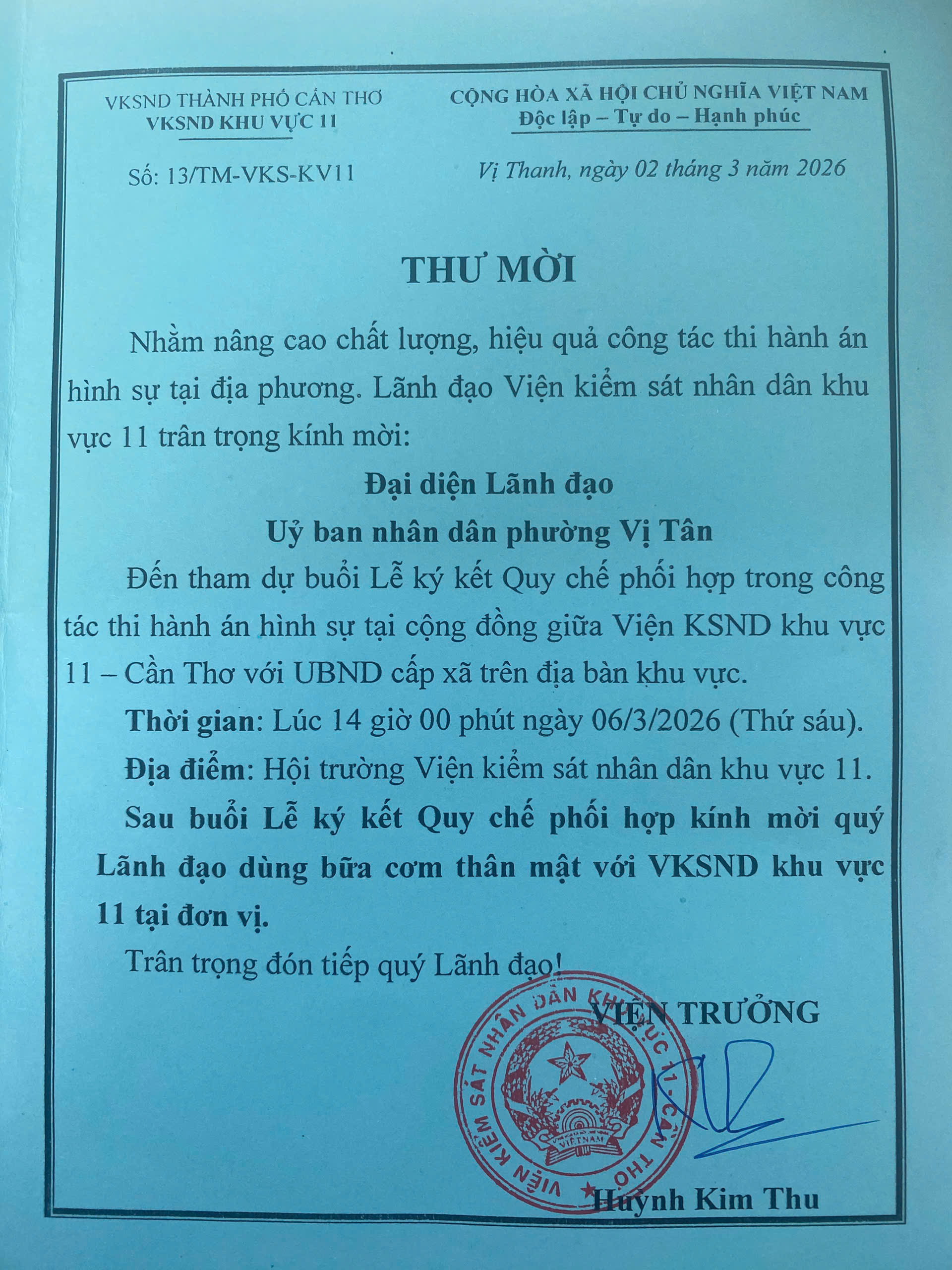 - 14 giờ 00: Phó Chủ tịch Lưu Văn Dủ đối thoại với các hộ dân về phương án bồi thường, hỗ trợ, tái định cư dự án Khu tái định cư phường IV theo quy định Luật Khiếu nại. Thành phần: Các đồng chí thành viên theo Quyết định số 296/QĐ-UBND ngày 10/02/2026 của Chủ tịch UBND phường Vị Tân (19. QD thành lập Tổ giải quyết khiếu nại, tố cáo.signed.pdf); Mời các hộ dân có liên quan. Điểm tại: Phòng họp UBND phường; LĐVP: Đ/c Sự. CVVP: Đ/c Trung. (Giao Phòng KTHT&ĐT chuẩn bị nội dung mời thành phần dự họp)