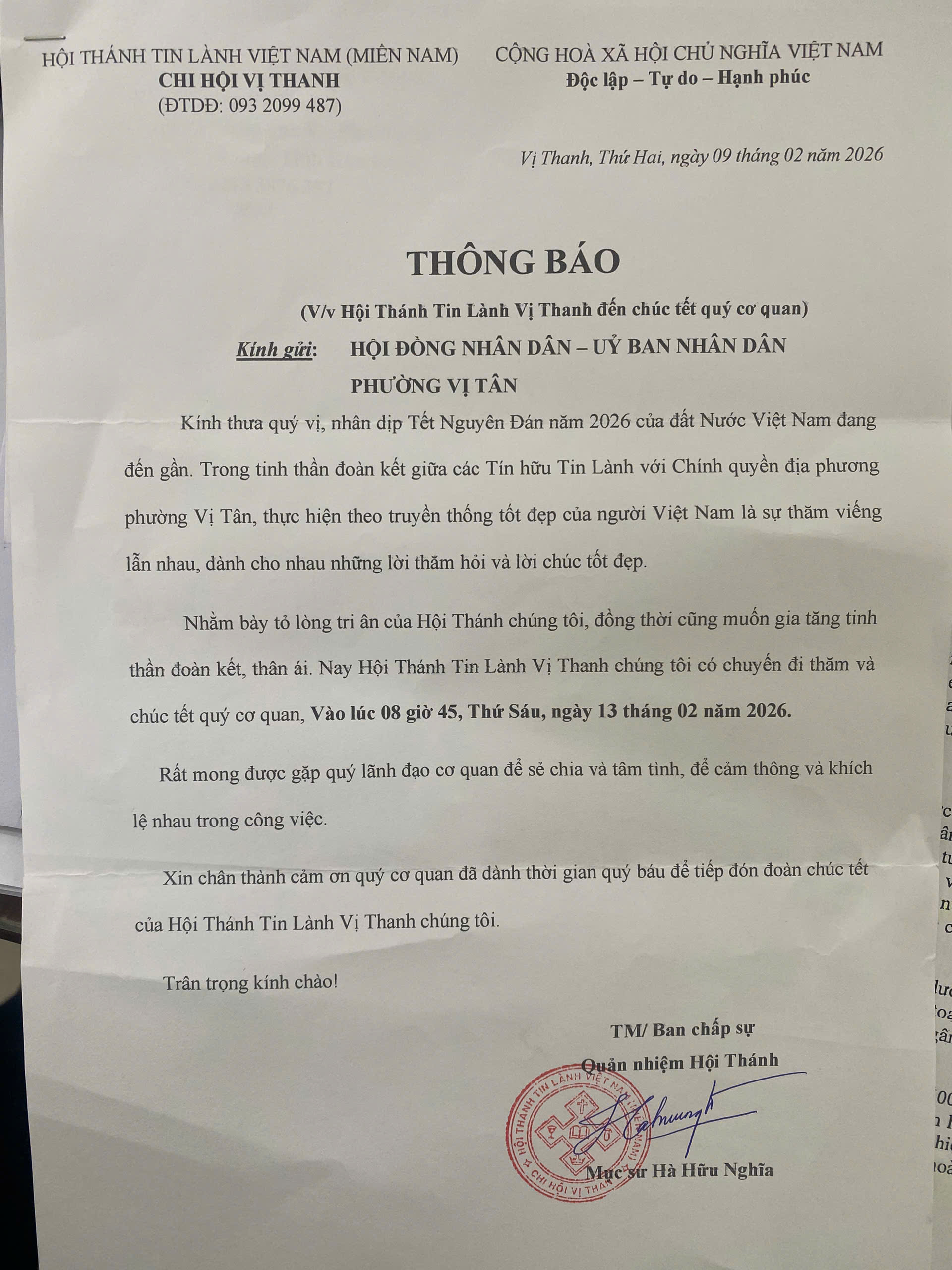 - 08 giờ 45: Phó Chủ tịch HĐND, Phó Chủ tịch Tô Minh Điền tiếp đoàn Hội Thánh Tin Lành Vị Thanh đến chúc tết cơ quan. Thành phần: Mời Đại diện lãnh đạo UBMTTQVN phường. Điểm tại: Phòng họp UBND phường; (Theo GM DỰ HỌP.jpg)